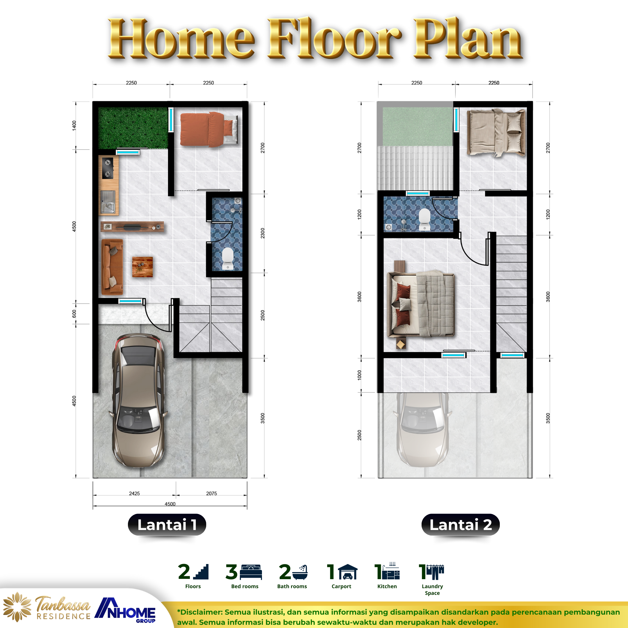 Tipe 60/60 | Dimensi 4,5×11 m dengan 3 kamar tidur, 2 kamar mandi, ruang keluarga, Carport.